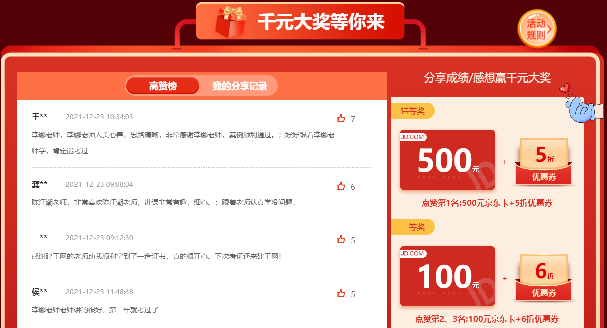 回望一年的一造備考之旅,這其中有艱辛、有汗水、有努力……,如此珍貴的備考經(jīng)驗(yàn)當(dāng)然應(yīng)該分享出來,快來參與網(wǎng)校一造備考成績(jī)/感想,點(diǎn)贊最高的可獲得:500元京東卡+5折優(yōu)惠券!猛戳進(jìn)入分享通道>>
