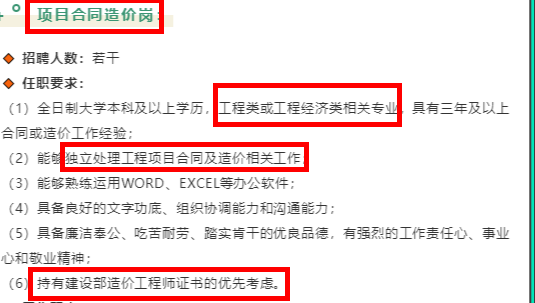 以下是某大型企業(yè)的招聘信息,招聘崗位是項目合同造價崗,最后任職要求里明確說到持有一級造價工程師證書的會被優(yōu)先考慮,所以這也足以說明這個證書是有一定優(yōu)勢的。