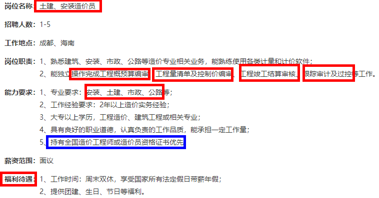 以下是某企業(yè)的招聘土建、安裝造價(jià)員的招聘簡章,后面也是明確說明了持有全國造價(jià)工程師或者造價(jià)員資格證書的人員優(yōu)先考慮,所以這個時候如果你有個一級造價(jià)工程師資格證書,那不就是很nice!