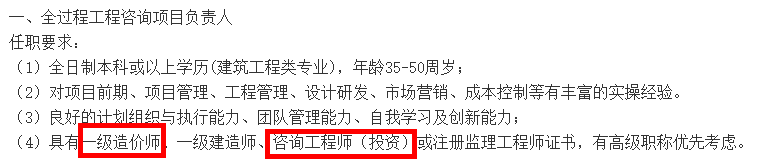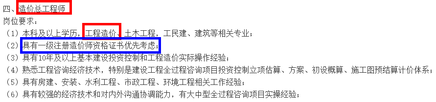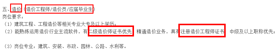 考證似乎成了現(xiàn)階段的一種潮流,各行各業(yè)招聘都會要求應(yīng)聘者持有相關(guān)的證書,有證書就具有一定的優(yōu)勢,就可以做更高的崗位,自然薪資水平等也會提高很多。所以對大家來說,年輕時(shí)多考證也是非常有必要的。以下是某大型企業(yè)招聘造價(jià)相關(guān)人員的招聘要求,其中都說明了具有一級造價(jià)工程師證書的人員會被優(yōu)先考慮,這也可以看出行業(yè)對于持證者是比較友好的。
