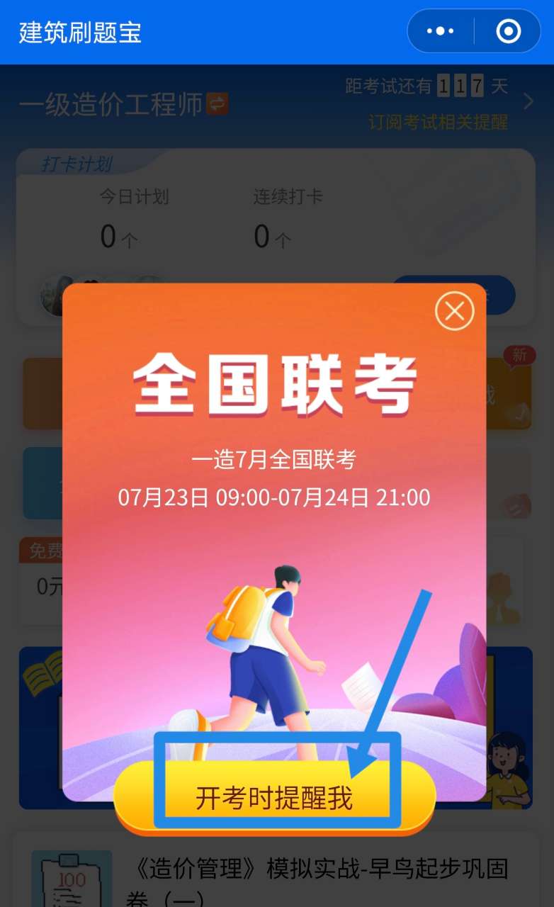 (3)進(jìn)入全國聯(lián)考后,點(diǎn)擊開考時(shí)提醒我,即可成功預(yù)約免費(fèi)聯(lián)考。