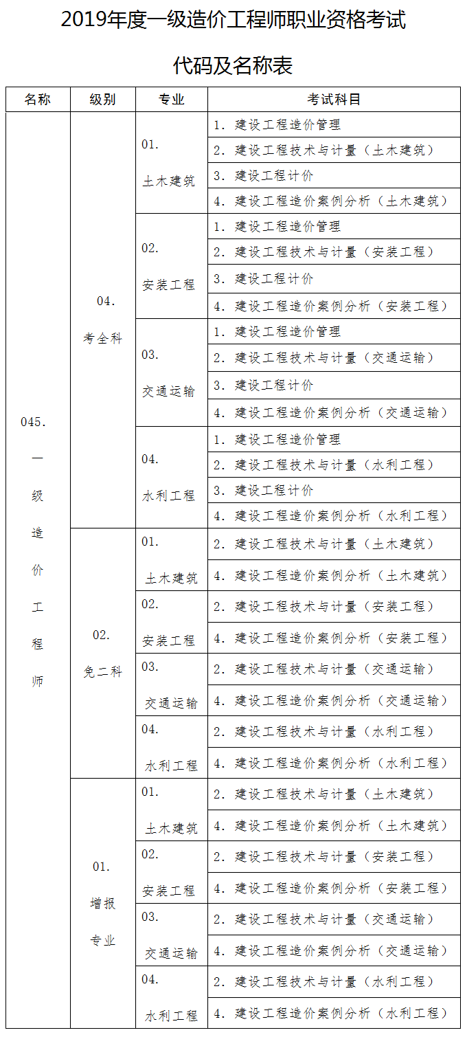 2.2019年度一級造價(jià)工程師職業(yè)資格考試代碼及名稱表