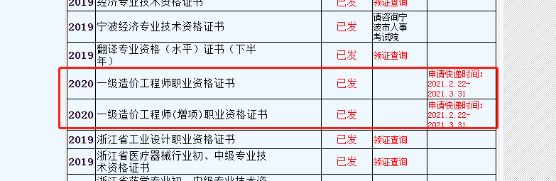 從浙江人事考試網(wǎng)得知,2020年一級造價師(含增項)證書可領(lǐng)取,申請快遞時間:2021.2.22-2021.3.31。