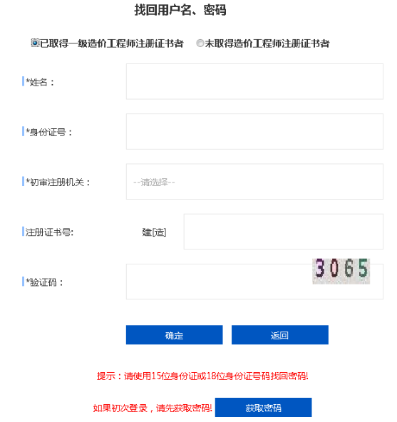 在個(gè)人登錄頁面,選擇“獲取密碼”,通過身份證號(hào)/軍官號(hào)/香港測(cè)量師互認(rèn)證號(hào)(任選其一)、證件號(hào)獲取密碼。