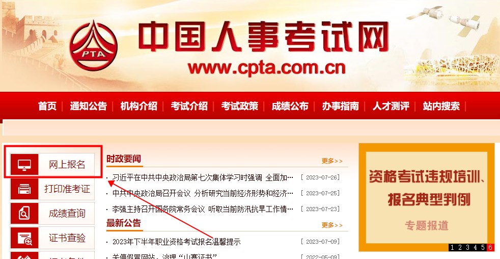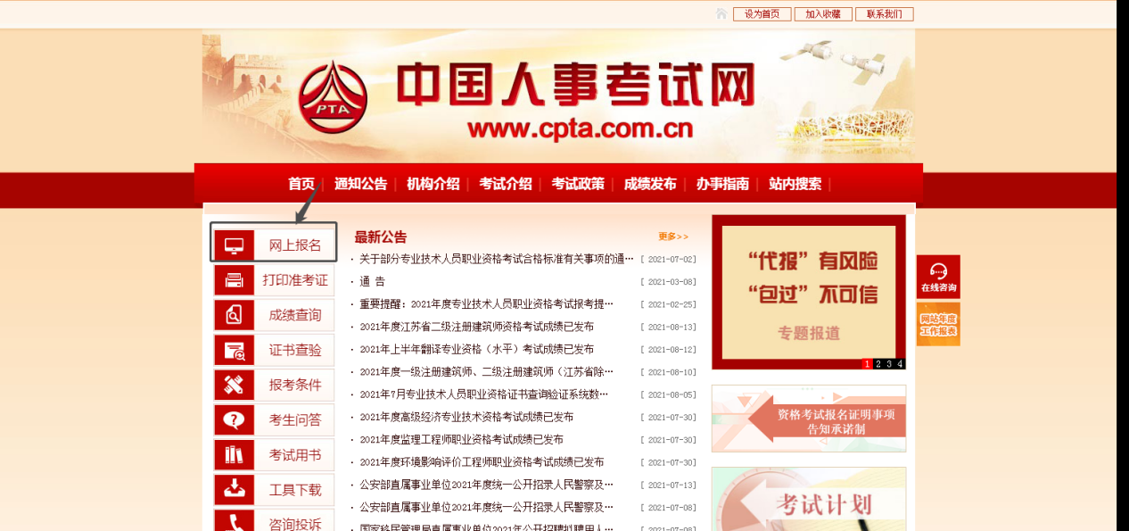 1.進(jìn)入“中國(guó)人事考試網(wǎng)”,點(diǎn)擊“網(wǎng)上報(bào)名”。
