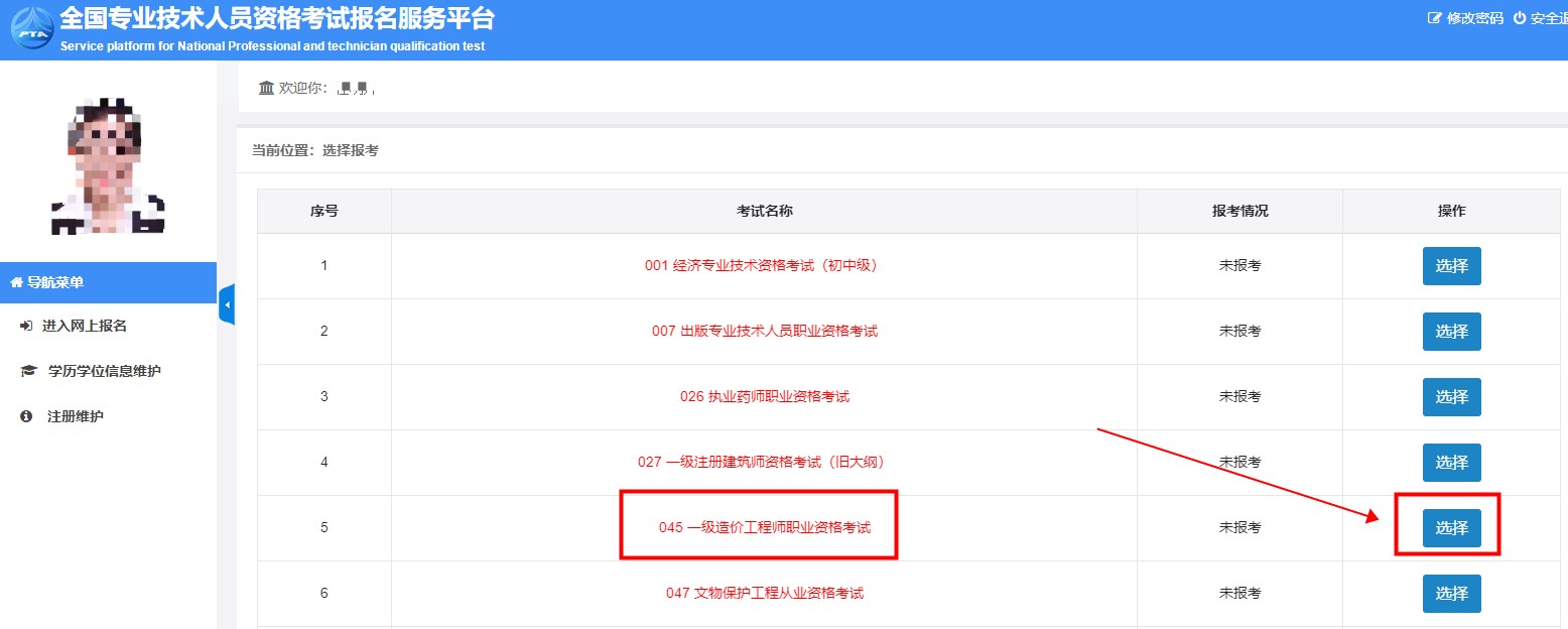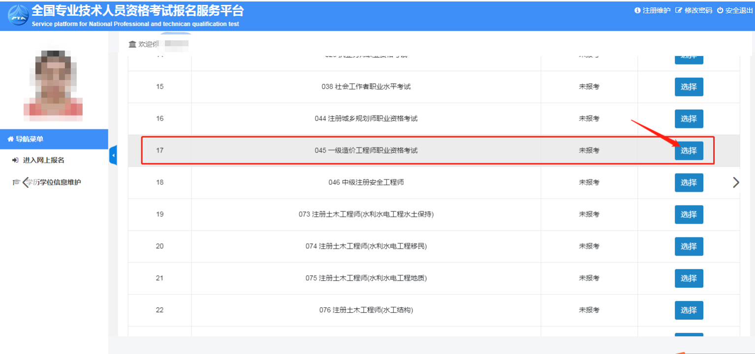 3.登錄“網(wǎng)報(bào)系統(tǒng)”后,下拉找到“045一級(jí)造價(jià)工程師職業(yè)資格考試”,點(diǎn)擊“選擇”。
