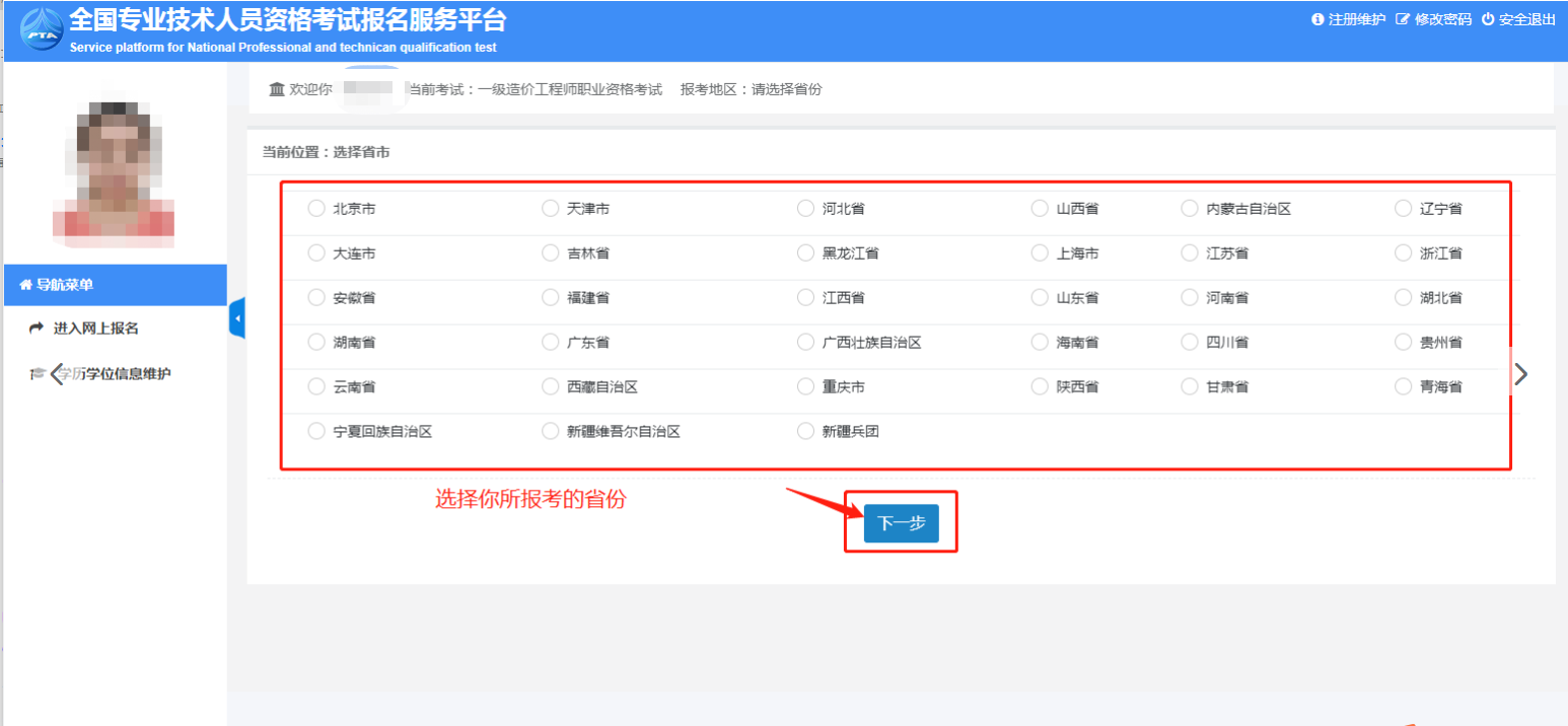 4.進(jìn)入“選擇省份”頁(yè)面,選中你需要報(bào)考的省份,點(diǎn)擊“下一步”。