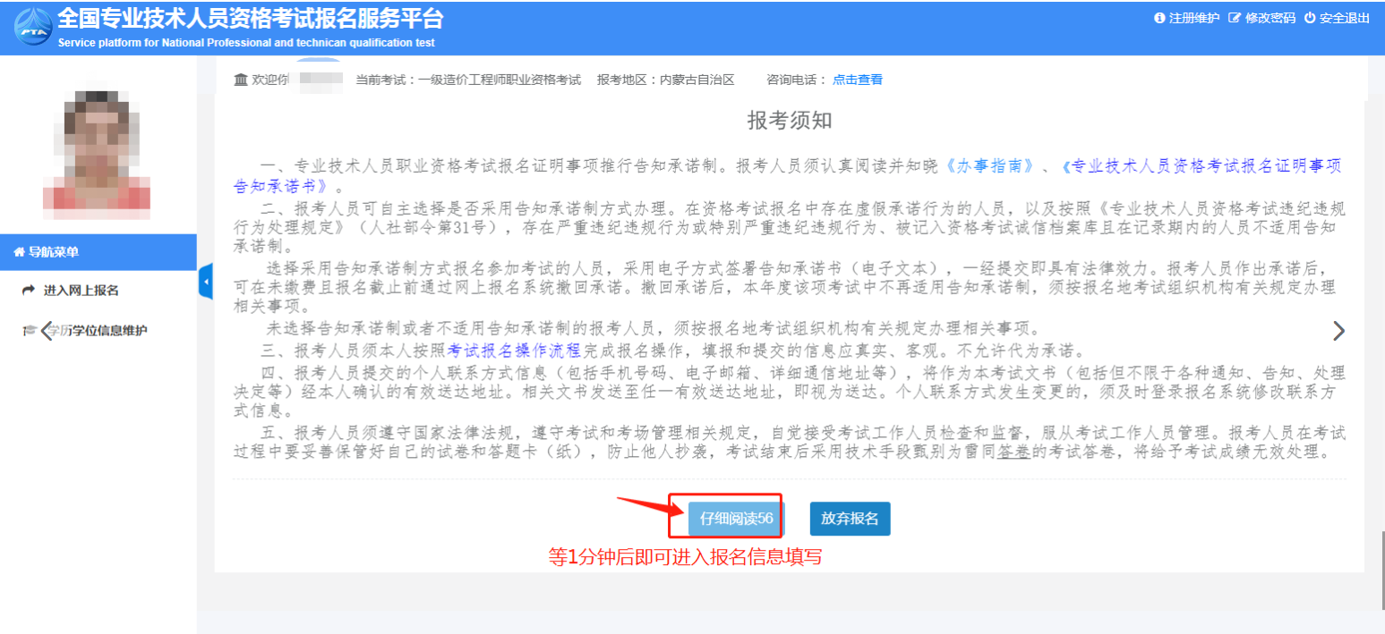 5.閱讀完報(bào)考須知(提醒:閱讀需要60秒);閱讀完畢點(diǎn)擊進(jìn)入。