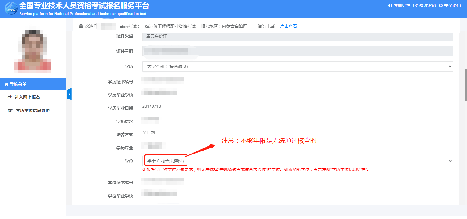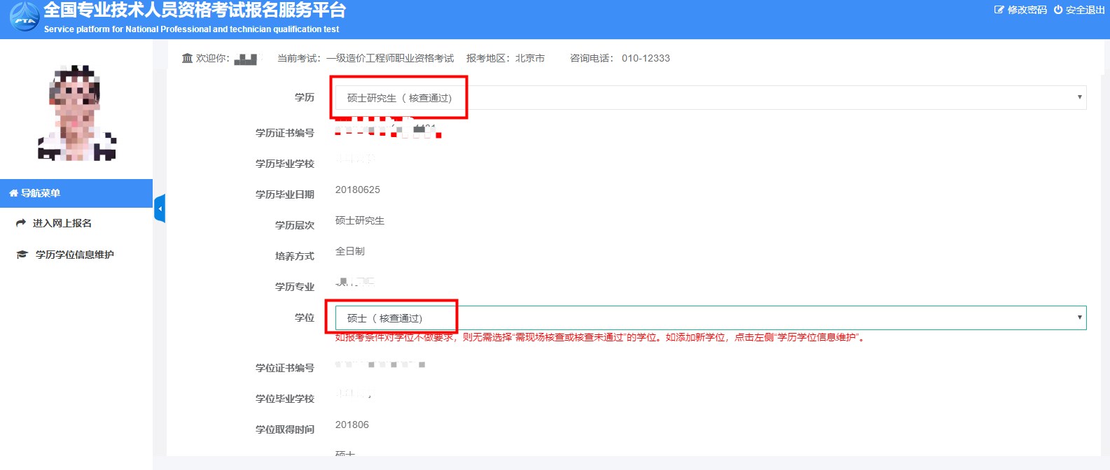 8.選擇學(xué)歷學(xué)位,學(xué)歷學(xué)位信息可在左側(cè)目錄“學(xué)歷學(xué)位信息維護(hù)”中添加。