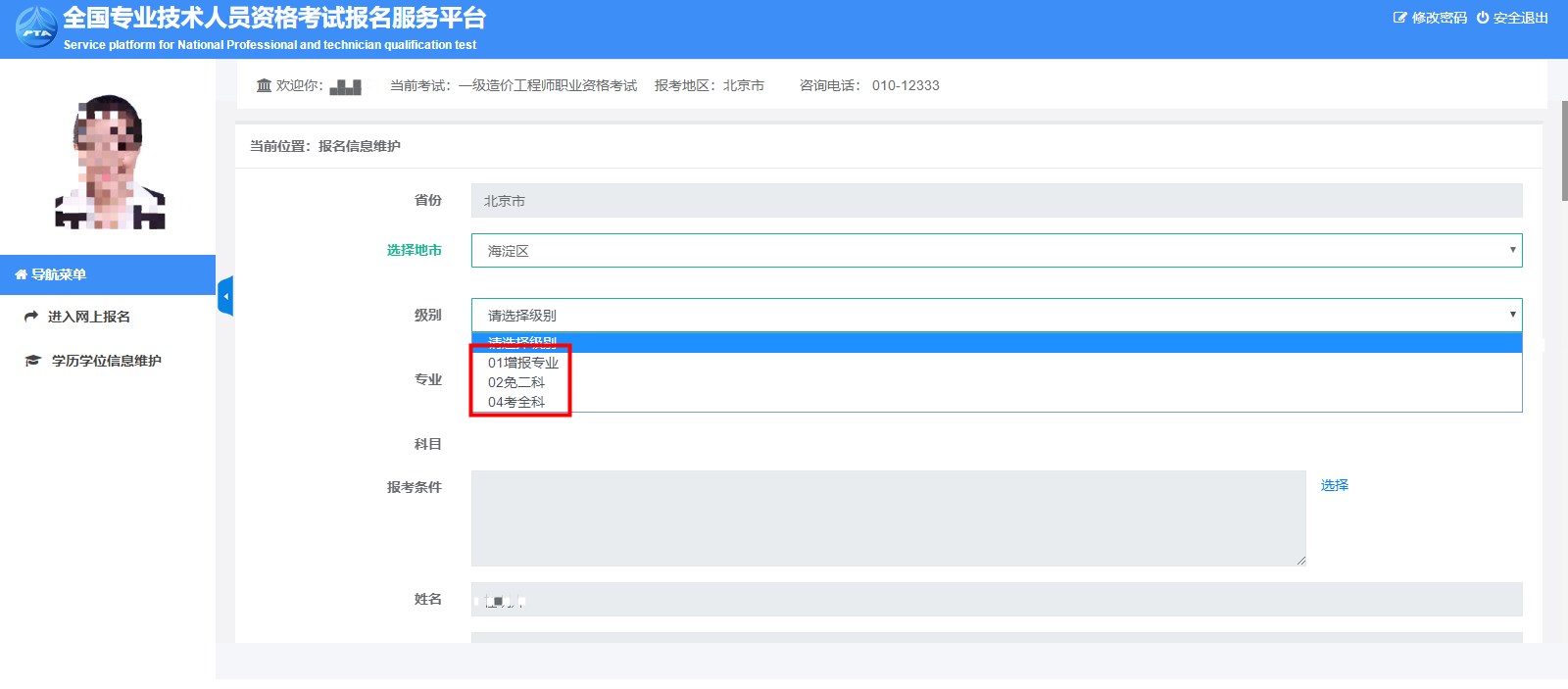 6.填寫(xiě)如下信息,注意:一定要填寫(xiě)真實(shí)信息,網(wǎng)上要進(jìn)行初審。級(jí)別、報(bào)考專業(yè)、報(bào)考科目可以根據(jù)自己的實(shí)際情況進(jìn)行選擇。
