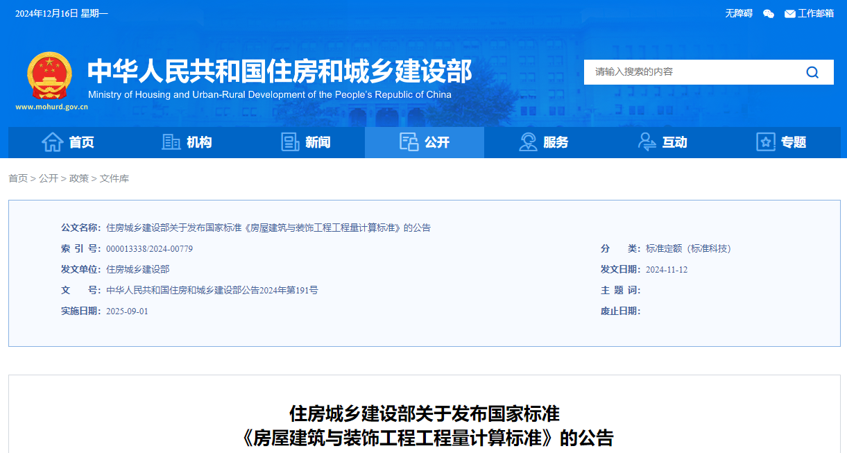 住房城鄉(xiāng)建設(shè)部關(guān)于發(fā)布國家標(biāo)準(zhǔn)《房屋建筑與裝飾工程工程量計算標(biāo)準(zhǔn)》的公告