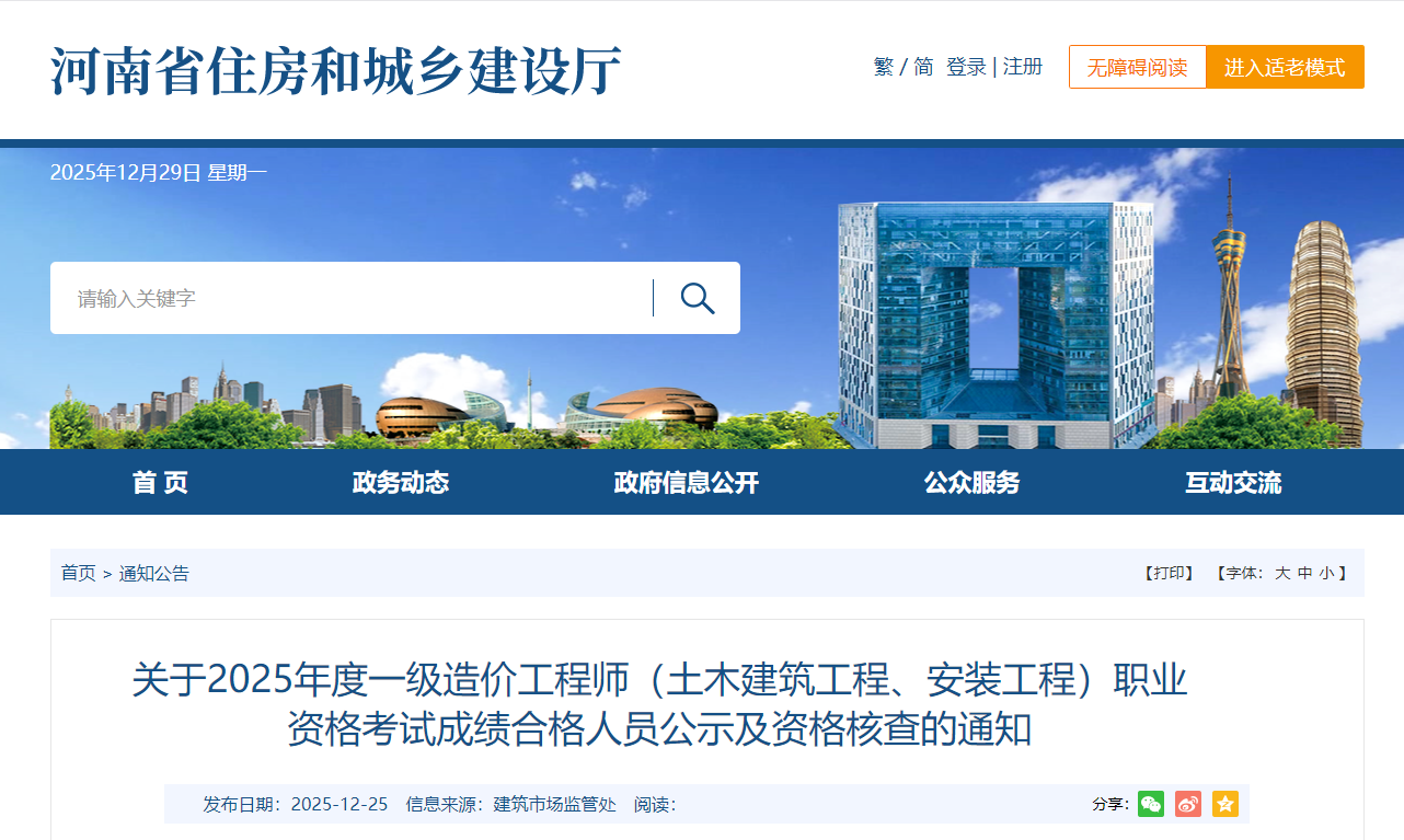 河南省2025年度一級造價工程師(土建、安裝)考試成績合格人員公示及資格核查通知