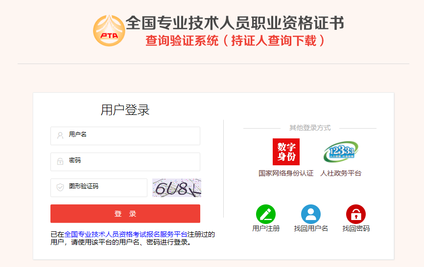 已在中國人事考試網(wǎng)“全國專業(yè)技術(shù)人員資格考試報名服務(wù)平臺”注冊過的持證人員,請直接使用該平臺的用戶名、密碼進(jìn)行登錄。