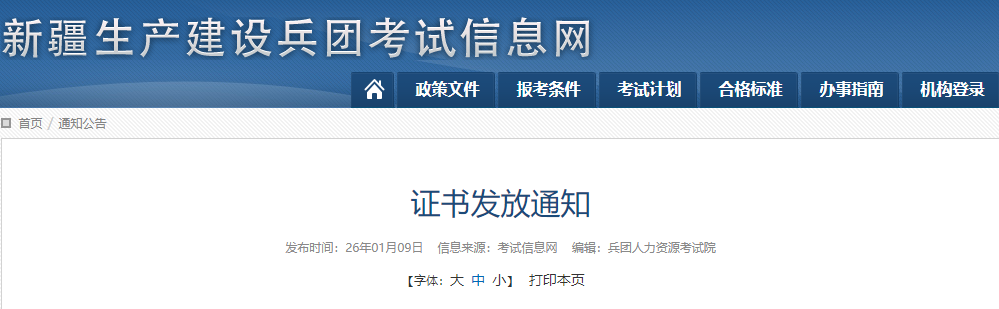 3、考生領取證書。兵直考生在兵團政務服務中心(烏魯木齊市天山區(qū)青年路775號2樓)領取,咨詢電話:0991-2899378、8880763;各師考生在所屬師局考試管理機構領取,領取事宜咨詢各師,聯(lián)系方式見“兵團考試信息網(wǎng)”“通知公告”欄目。