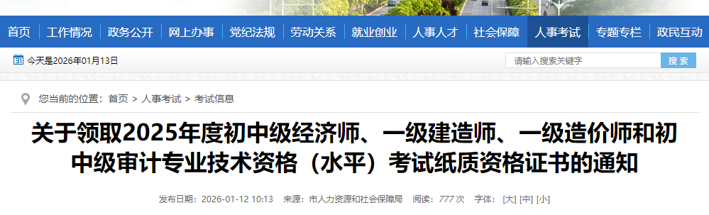 關(guān)于領(lǐng)取2025年度初中級經(jīng)濟師、一級建造師、一級造價師和初中級審計專業(yè)技術(shù)資格(水平)考試紙質(zhì)資格證書的通知