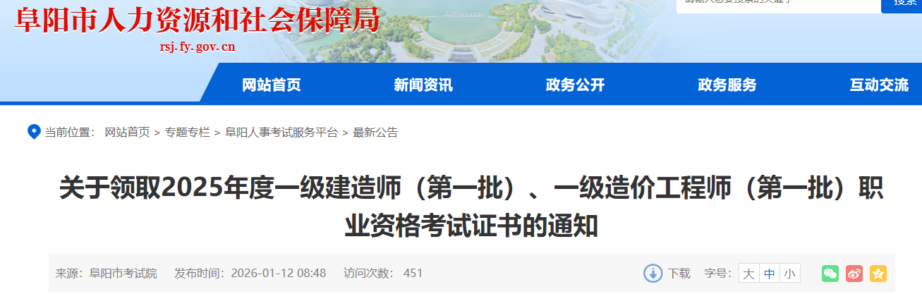 安徽省阜陽(yáng)市2025年一級(jí)造價(jià)師考試證書(shū)領(lǐng)取通知