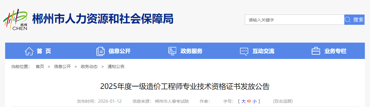 湖南郴州2025年度一級造價工程師專業(yè)技術資格證書發(fā)放公告