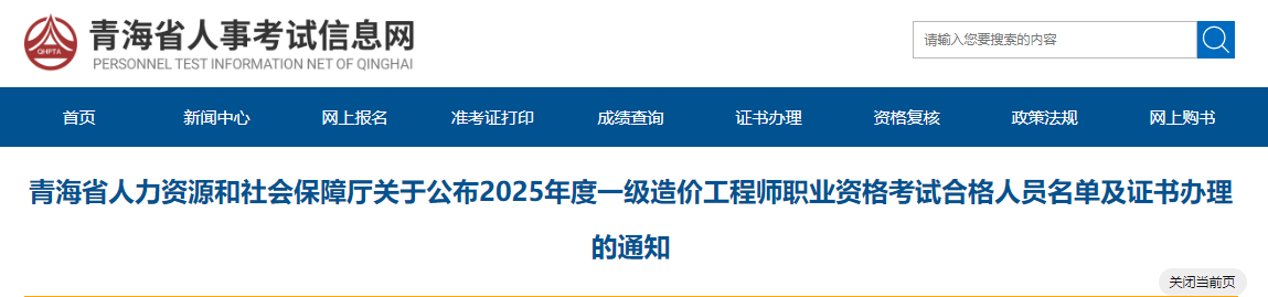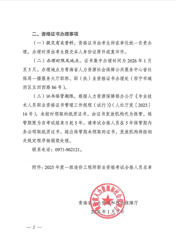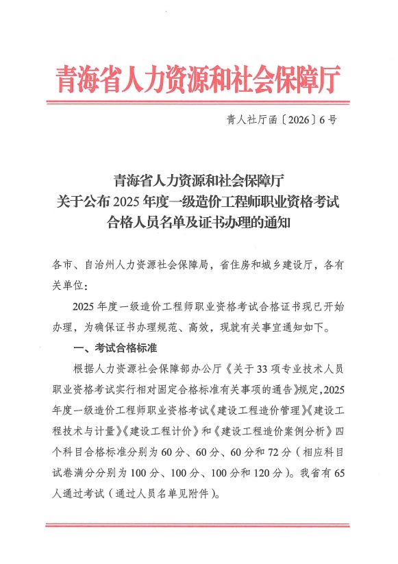 青海省人力資源和社會保障廳關于公布2025年度一級造價工程師職業(yè)資格考試合格人員名單及證書辦理的通知