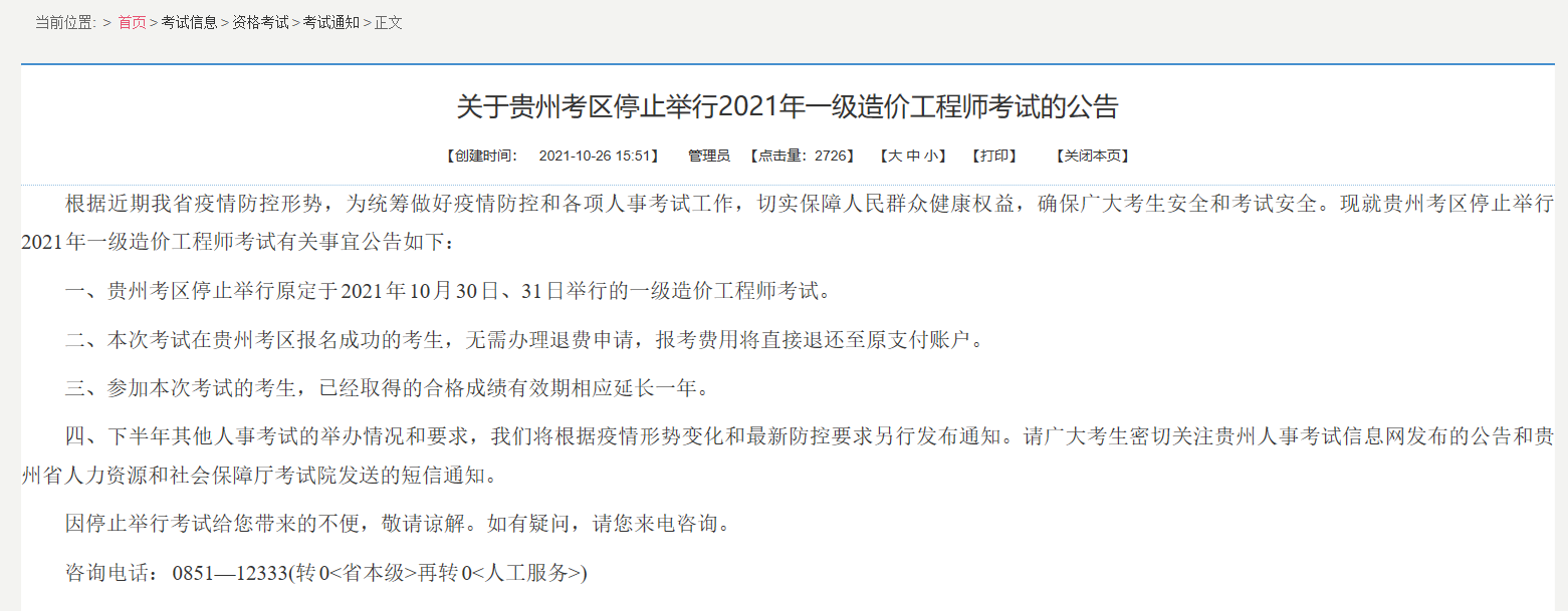 關(guān)于貴州考區(qū)停止舉行2021年一級(jí)造價(jià)工程師考試的公告