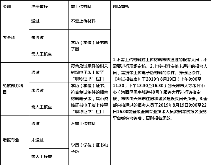 備注:(1)2019年8月6日9:00至8月15日16:00登錄全國專業(yè)技術(shù)人員資格考試報名服務(wù)平臺進(jìn)行上傳相關(guān)資料電子版,審核部門將于2019年8月12日9:00開始對上傳材料進(jìn)行審核。