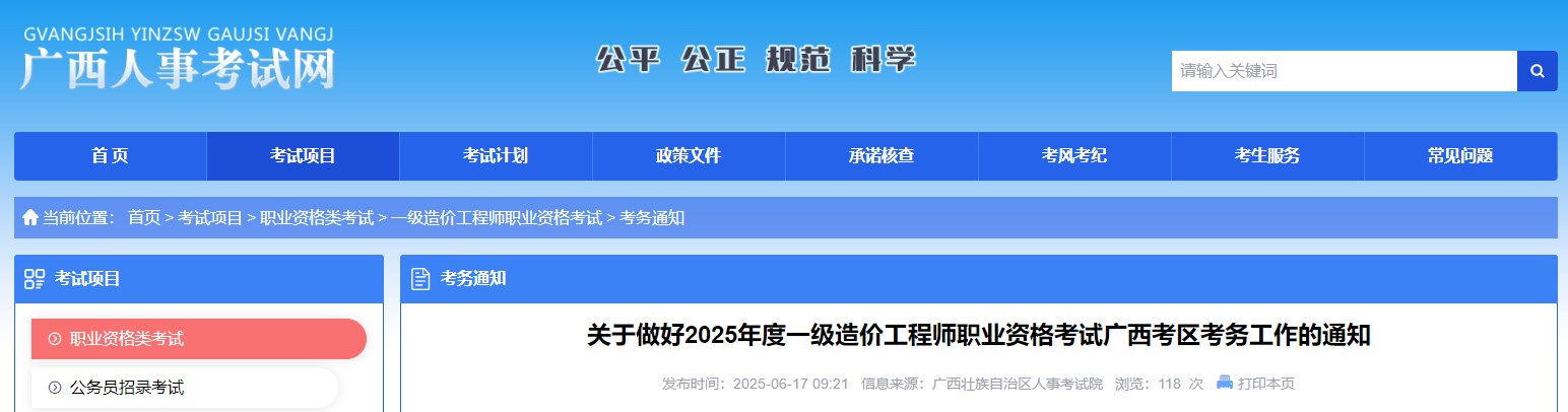 根據(jù)《人力資源和社會保障部人事考試中心關(guān)于2025年度一級造價(jià)工程師職業(yè)資格考試考務(wù)工作的通知》(人考中心函〔2025〕22號)精神,為做好2025年度一級造價(jià)工程師職業(yè)資格考試廣西考區(qū)考務(wù)工作,現(xiàn)將有關(guān)事項(xiàng)通知如下: