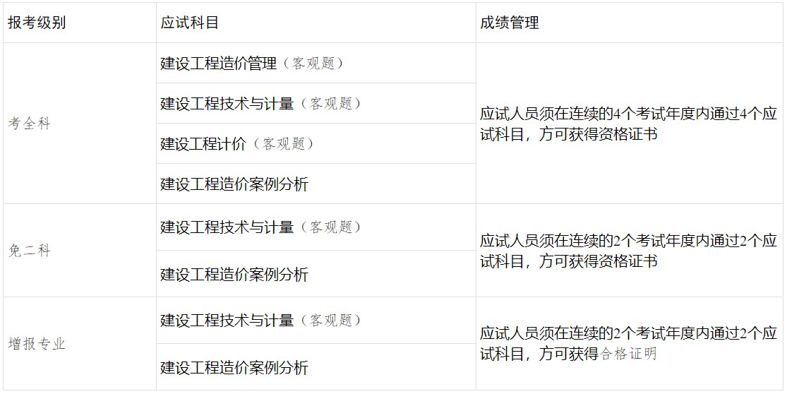 注:《建設(shè)工程造價(jià)管理》和《建設(shè)工程計(jì)價(jià)》為基礎(chǔ)科目;《建設(shè)工程技術(shù)與計(jì)量》和《建設(shè)工程造價(jià)案例分析》為專業(yè)科目,分為土木建筑工程、交通運(yùn)輸工程、水利工程和安裝工程4個專業(yè)類別,報(bào)考人員可根據(jù)實(shí)際工作需要選報(bào)其一。