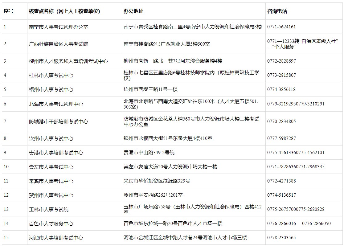 全區(qū)人事考試組織機(jī)構(gòu)(核查點(diǎn))地址及聯(lián)系方式