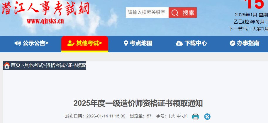 湖北省潛江市2025年度一級(jí)造價(jià)工程師資格證書領(lǐng)取通知