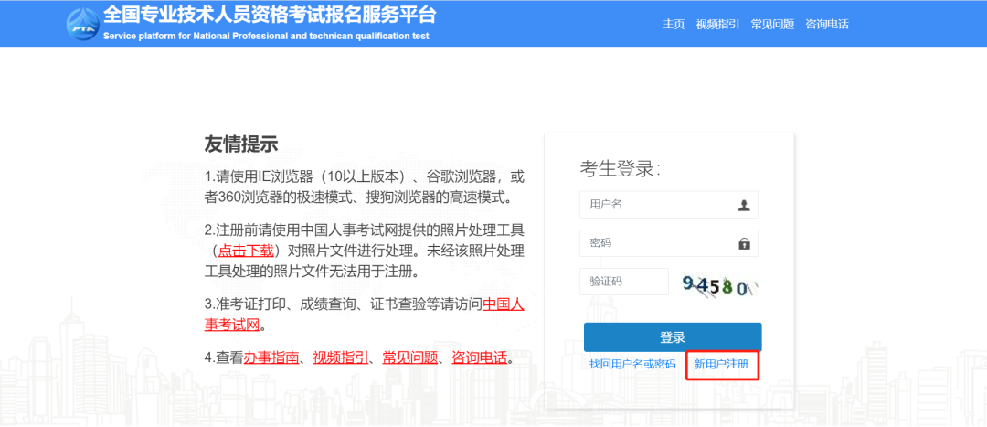 1.打開中國(guó)人事考試網(wǎng),點(diǎn)擊“網(wǎng)上報(bào)名”,進(jìn)入“全國(guó)專業(yè)技術(shù)人員資格考試報(bào)名服務(wù)平臺(tái)”,點(diǎn)擊注冊(cè)。
