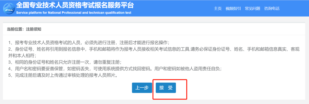 2.閱讀《專業(yè)技術(shù)人員資格考試網(wǎng)上報(bào)名協(xié)議》,點(diǎn)擊接受,進(jìn)入下一步。