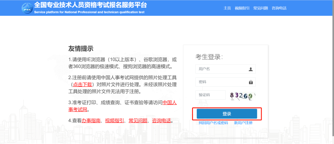 1.打開中國(guó)人事考試網(wǎng),點(diǎn)擊“網(wǎng)上報(bào)名”,進(jìn)入“全國(guó)專業(yè)技術(shù)人員資格考試報(bào)名服務(wù)平臺(tái)”,登錄帳號(hào)。