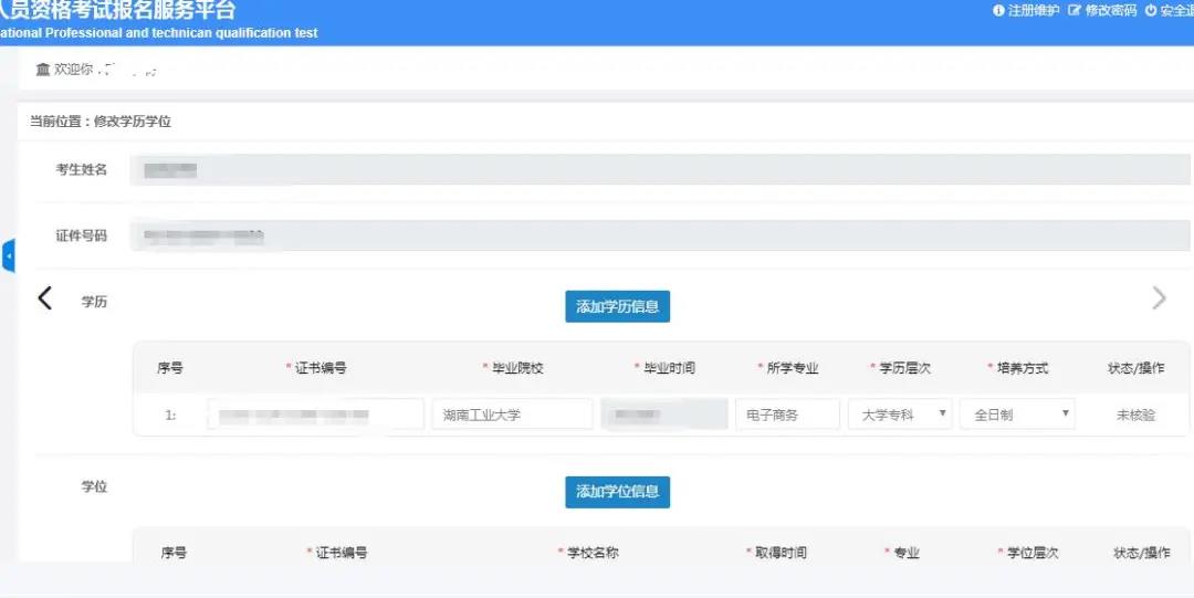 2.出現(xiàn)填寫信息的頁面,考生需要完善學(xué)歷學(xué)位信息。