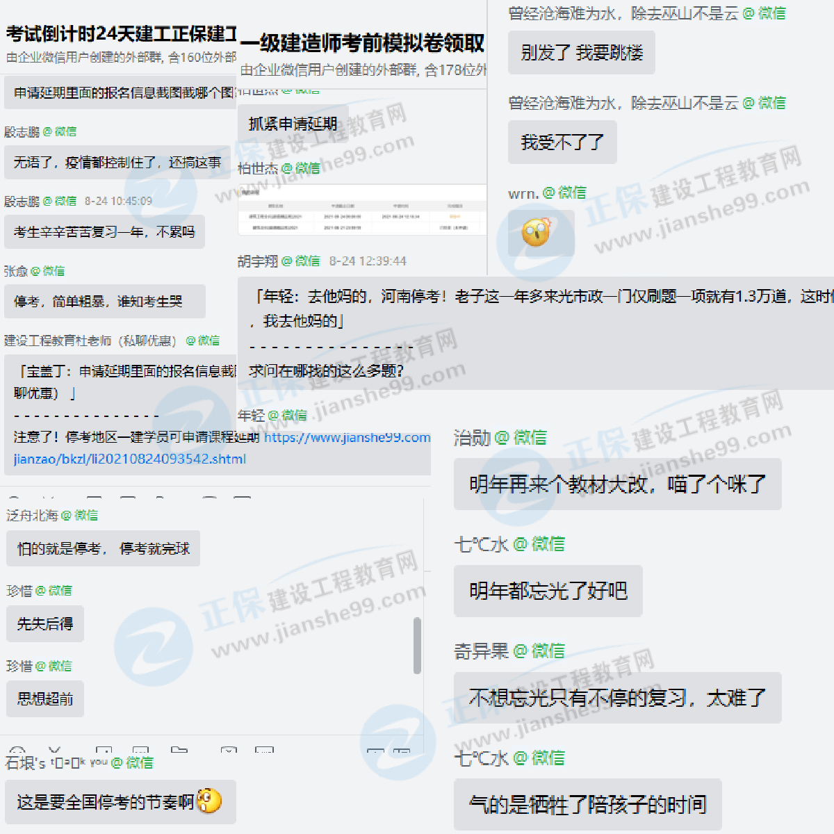 今日,江蘇、河南、陜西發(fā)布了2021年一級(jí)建造師??纪ㄖ?,考生們坐不住了,在群里紛紛議論起來,有的童鞋說:備考了這么久,這個(gè)時(shí)候說不考了,要跳樓的心都有了!有的學(xué)員說:光市政就做了1.3萬題目,現(xiàn)在說停考了!還有的學(xué)員說:辛辛苦苦復(fù)習(xí)一年,誰(shuí)知學(xué)員苦?……