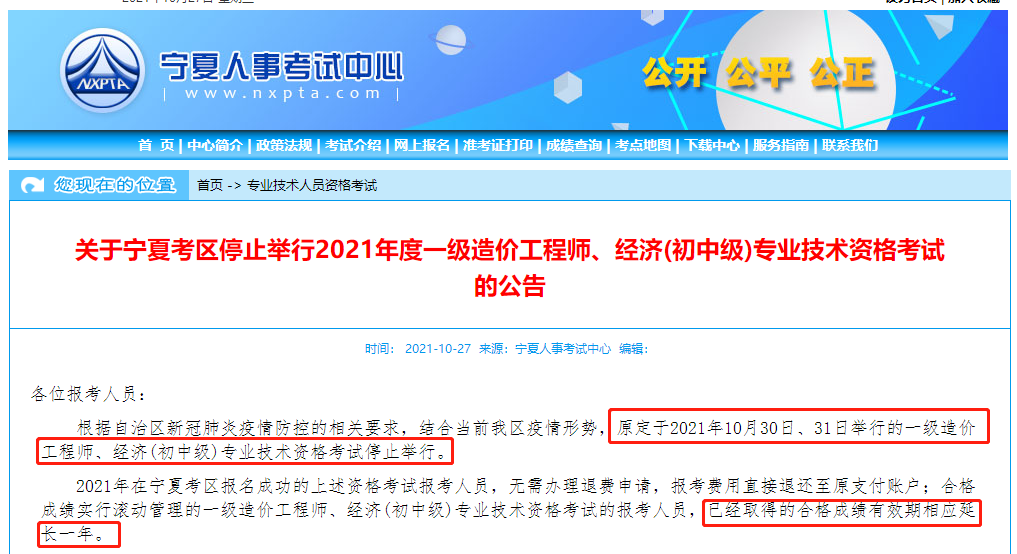 關(guān)于寧夏考區(qū)停止舉行2021年度一級造價工程師、