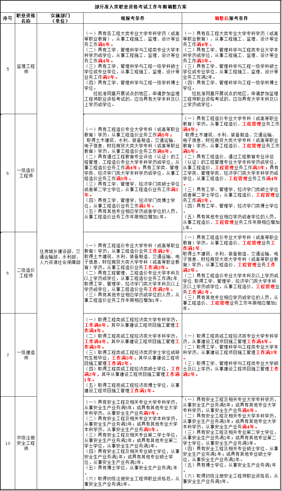 人力資源和社會保證部于12月3日發(fā)布《關(guān)于部分準入類職業(yè)資格考試工作年限調(diào)整方案公示》,涉及:一級造價工程師、二級造價工程師、監(jiān)理工程師、一級建造師、中級注冊安全工程師,工作年限要求降低!放低報考門檻!是不是說明需要的專業(yè)人才更多?市場需求量大?供不應(yīng)求?原本不符合條件的你,現(xiàn)在可以報考了?不用再等明年或后年?。。∽プ∵@次機會,證書離你更近一步!