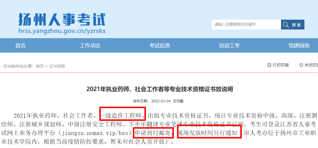 2021年執(zhí)業(yè)藥師、社會(huì)工作者、一級(jí)造價(jià)工程師、出版專業(yè)技術(shù)資格證書、統(tǒng)計(jì)專業(yè)技術(shù)資格中級(jí)、高級(jí)、注冊(cè)測繪師、注冊(cè)城鄉(xiāng)規(guī)劃師、中級(jí)注冊(cè)安全工程師、下半年翻譯專業(yè)筆譯專業(yè)技術(shù)資格證書已到。考生可登錄江蘇省人事考試網(wǎng)上業(yè)務(wù)辦理平臺(tái)(jiangsu.nomax.vip/bas)申請(qǐng)到付郵寄,現(xiàn)場發(fā)放時(shí)間另行通知(市人考辦位于揚(yáng)州市工業(yè)職業(yè)技術(shù)學(xué)院內(nèi),根據(jù)當(dāng)前疫情防控要求,暫未對(duì)社會(huì)人員開放)。