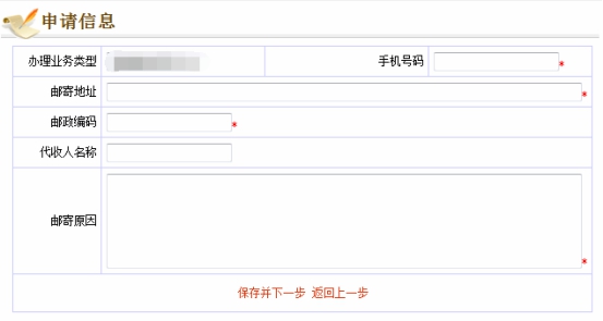 第七步:在點(diǎn)擊同意“考生郵寄服務(wù)承諾書”后,填寫郵寄信息,包括手機(jī)號碼、郵寄地址、郵政編碼、收件人等,然后點(diǎn)擊“保存并下一步”。