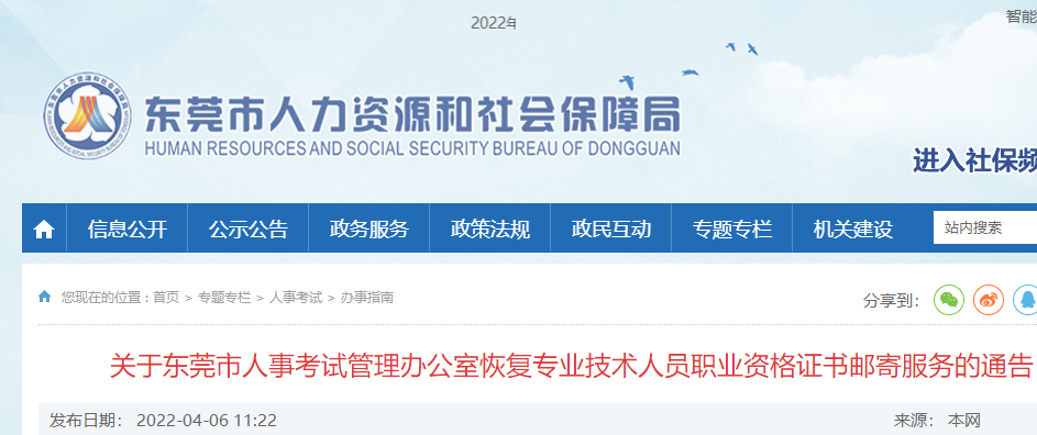 從2022年4月7日起,東莞市人事考試管理辦公室恢復專業(yè)技術人員職業(yè)資格證書郵寄服務。已通過專業(yè)技術人員職業(yè)資格考試的市民朋友如需領取職業(yè)資格紙質(zhì)證書,本人可登錄廣東省專業(yè)技術人員職業(yè)資格考試業(yè)務辦理系統(tǒng)申請辦理證書郵寄(使用微信掃碼登錄→選擇最后一項“證書郵寄”,點擊“進入”→選擇相應的考試項目→填寫您的收件人姓名、地址、電話號碼→提交申請)。