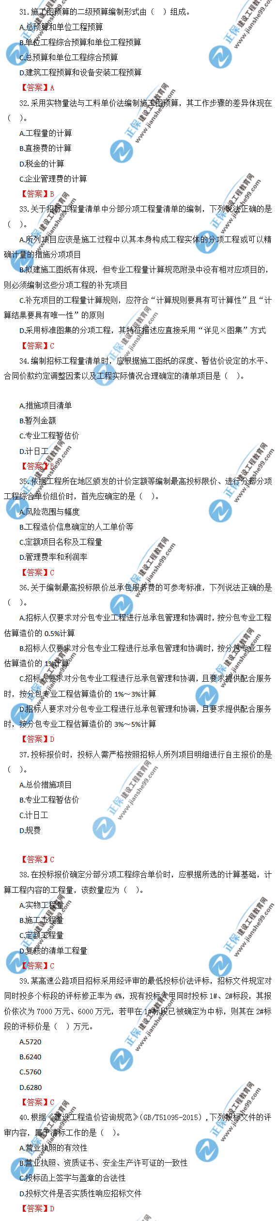 2019年一級造價師《建設工程計價》試題及答案解析31-40