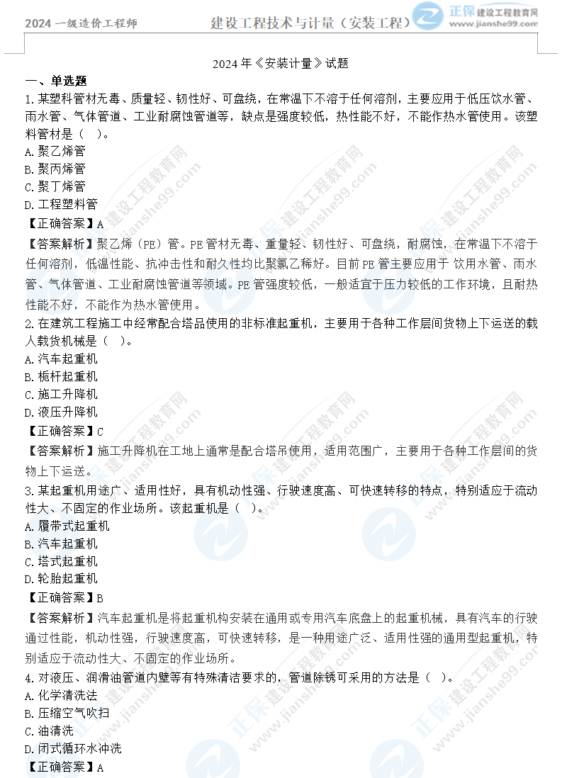 更多題目點(diǎn)擊下載2024年一級(jí)造價(jià)師建設(shè)工程技術(shù)與計(jì)量(安裝)真題及答案解析