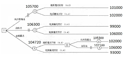 2. 列式計算事件1中施工方案選擇的決策過程,并按成本最低原則確定最佳施工方案。