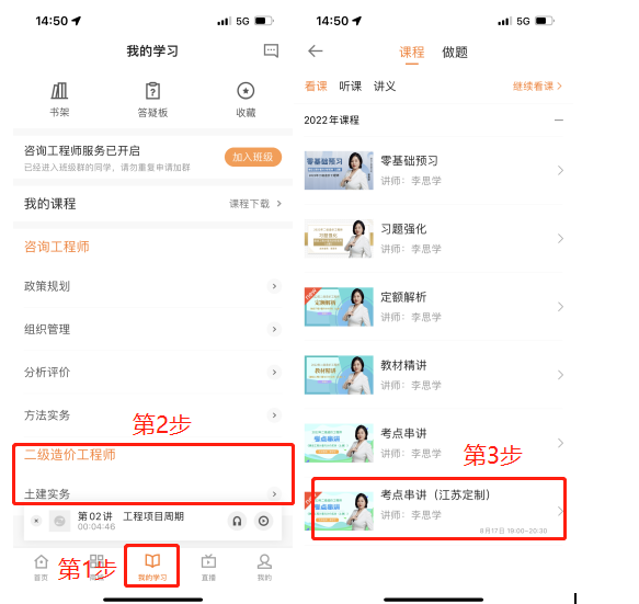 APP:下載“建設(shè)工程教育網(wǎng)”APP——點擊“我的學(xué)習(xí)”——找到二級造價師——土建實務(wù)——“考點串講(江蘇定制)”——準(zhǔn)時進(jìn)入直播