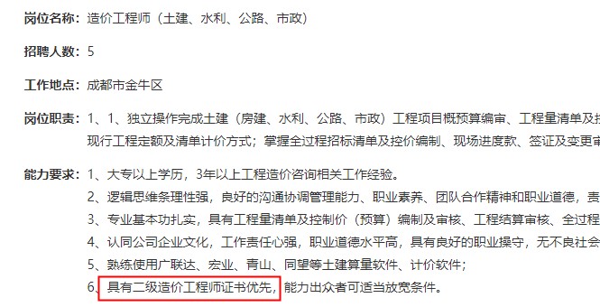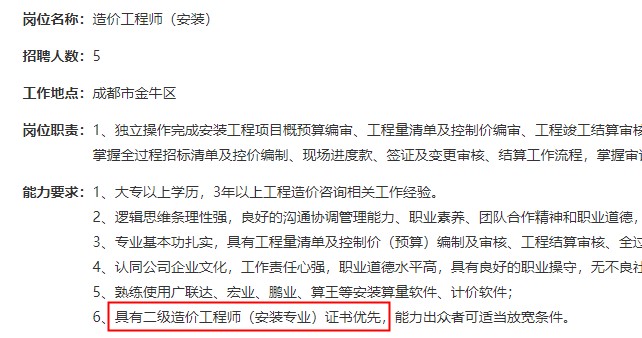 近日,四川某大型工程項(xiàng)目管理公司就公開招聘造價(jià)師,有二級(jí)造價(jià)師證書的優(yōu)先!