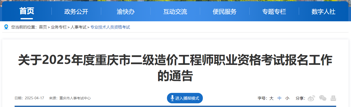 按照重慶市人力資源和社會保障局辦公室《關(guān)于印發(fā)2025年度人事考試工作計劃的通知》(渝人社辦〔2025〕13號)和重慶市人事考試中心《關(guān)于做好2025年度重慶市二級造價工程師職業(yè)資格考試考務(wù)工作的通知》(渝人考〔2025〕18號)要求,為方便廣大考生報考,現(xiàn)將有關(guān)事項通告如下: