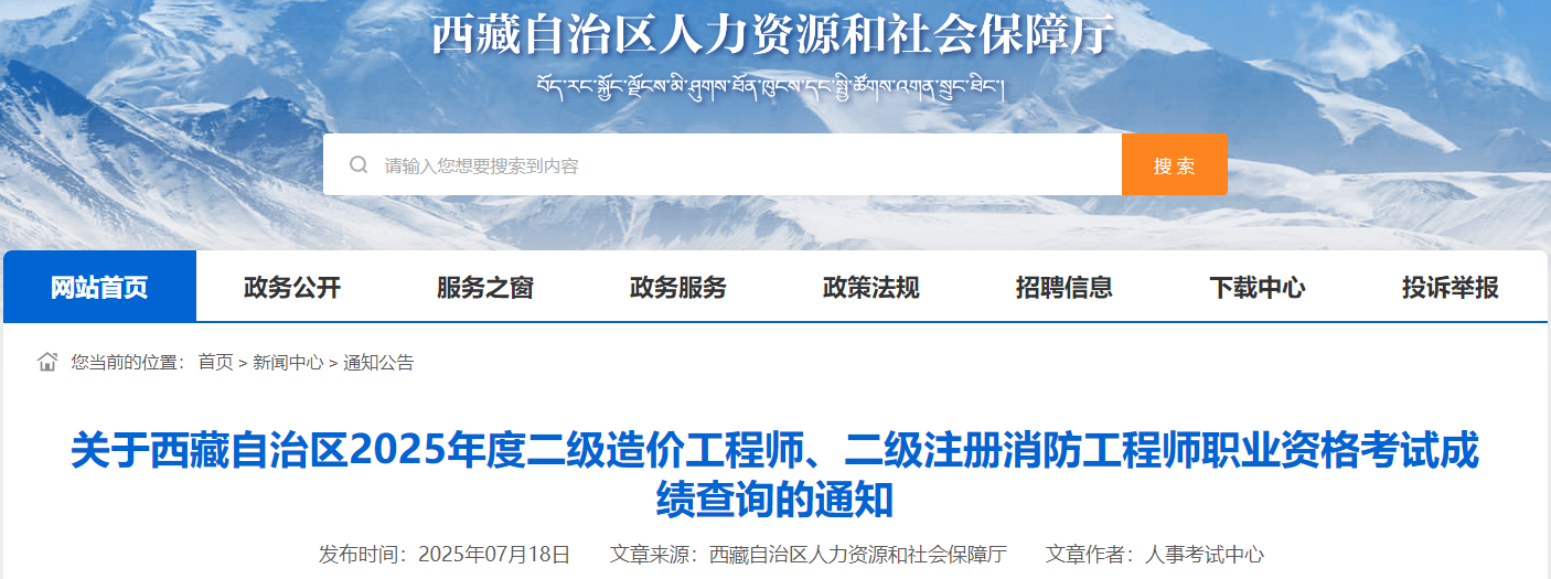 關(guān)于西藏自治區(qū)2025年度二級造價工程師、二級注冊消防工程師職業(yè)資格考試成績查詢的通知