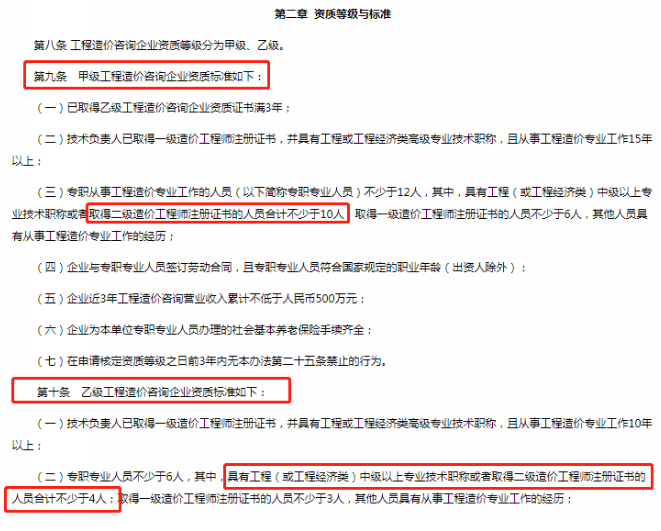 根據(jù)住房和城鄉(xiāng)建設部關于修改《工程造價咨詢企業(yè)管理辦法》《注冊造價工程師管理辦法》的決定,其中首次明確了在認定造價咨詢企業(yè)資質(zhì)時二級造價工程師同等于中級職稱。