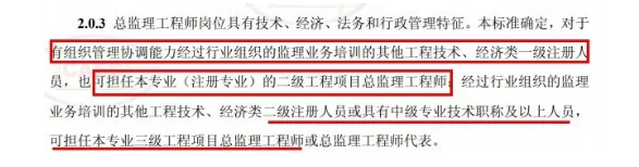 中國建設監(jiān)理協(xié)會頒布的《項目監(jiān)理機構人員配置標準》(試行),明確一級類注冊證(常見的就是一級建造師、一級造價師、安全工程師等),二級類注冊證(二級建造師、二級造價師),可以擔任總監(jiān)理工程師。