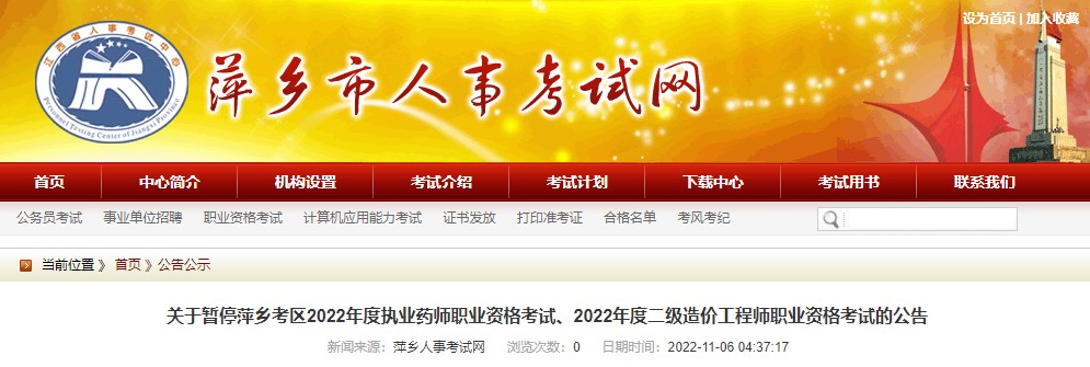 關于暫停萍鄉(xiāng)考區(qū)2022年度執(zhí)業(yè)藥師職業(yè)資格考試、2022年度二級造價工程師職業(yè)資格考試的公告