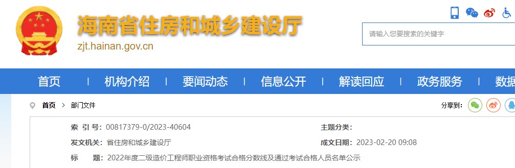 海南省2022年二級造價師考試合格分?jǐn)?shù)線及合格人員名單公示