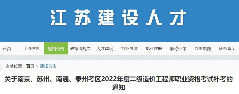 江蘇關(guān)于南京、蘇州、南通、泰州考區(qū)2022年度二級(jí)造價(jià)師考試補(bǔ)考通知